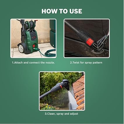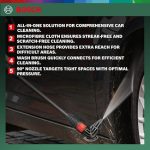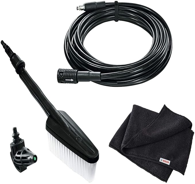 Teslimat kapsamı: Yıkama fırçası (F016800359), 90° püskürtme nozülü (F016800354), 6 m uzatma hortumu (F016800361), mikrofiber polisaj bezi