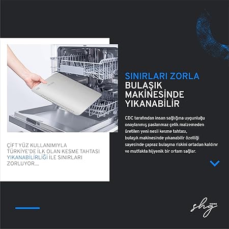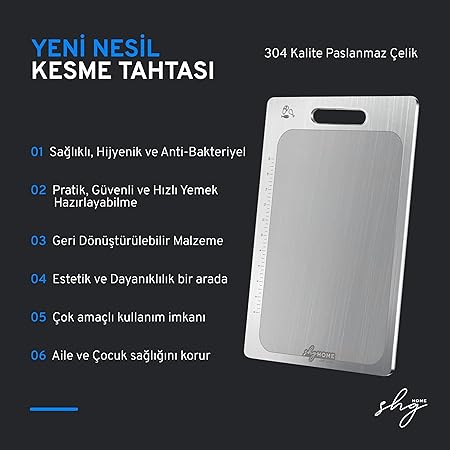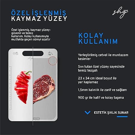 Premium Malzeme: 304 kalite paslanmaz çelikten üretilmiştir; gıda temasına uygundur ve paslanmaya karşı dayanıklıdır. Bıçak Dostu Yüzey: Düşük karbon içeriği sayesinde bıçaklarınızın keskinliğini korur; körelmeyi minimize eder. Hijyenik ve Kolay Temizlik: Gözeneksiz yüzeyi sayesinde bakteri barınmaz; bulaşık makinesinde yıkanabilir. Çift Taraflı Kullanım: Et ve sebzeler için ayrı yüzeyler; çapraz kontaminasyonu önler. Kaymaz Taban: Silikon mat ile birlikte gelir; kesim sırasında stabilite sağlar.