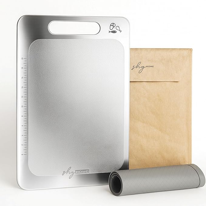 Home Özel Tasarımlı 304 Paslanmaz Çelik Kesme Tahtası 3lü set (Saklama Kılıfı, Kesme Tahtası ve Silikon Kaydırmaz Mat)1,5 mm Kalınlık, 23 X 34 cm Yıkanabilir, Gıda Temasına Uygun, Hijyenik