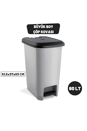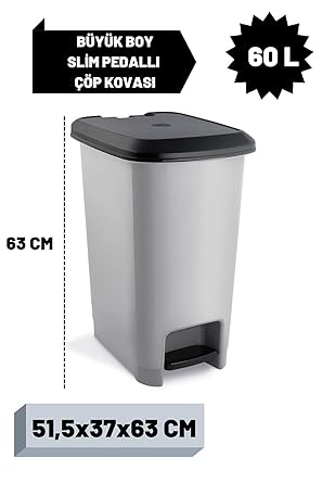 Home Slim Pedallı Çöp Kovası 60 Litre & Büyük Boy Pedallı Çöp Kovası Gri Metalik Gri