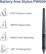 Pilsiz Stylus PW500: EMR pilsiz teknolojisi ile PW500 stylus pil veya şarj gerektirmez. 8192 kalem basıncı, 60 derece eğim fonksiyonu ve 266 pps rapor hızı ile birlikte, olağanüstü hassasiyet ve duyarlı kontrol ile elinizin doğal bir uzantısı olacak şekilde tasarlanmıştır, size en doğal kağıt benzeri çizim deneyimini sunar.