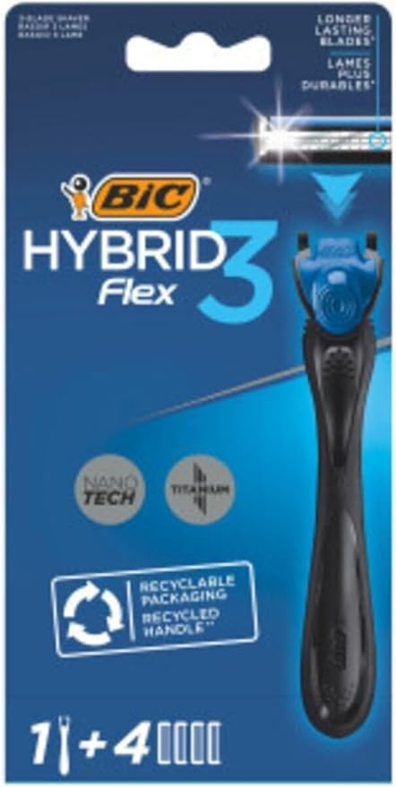 BIC Hybrid 3 Flex hepsi bir arada erkek tıraş bıçağı seti, hepsi geri dönüşümlü karton ambalajında 1 sap ve 4 adet üçlü kartuşla gelir