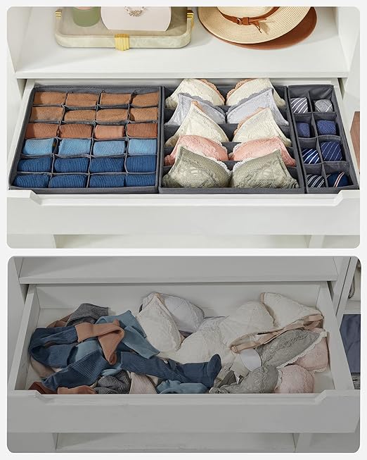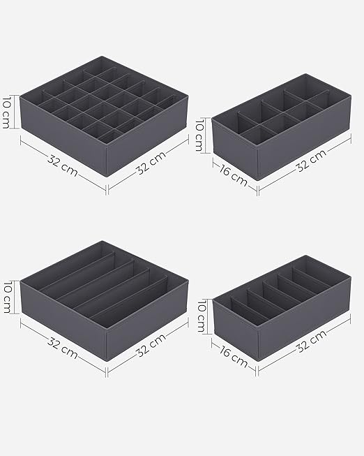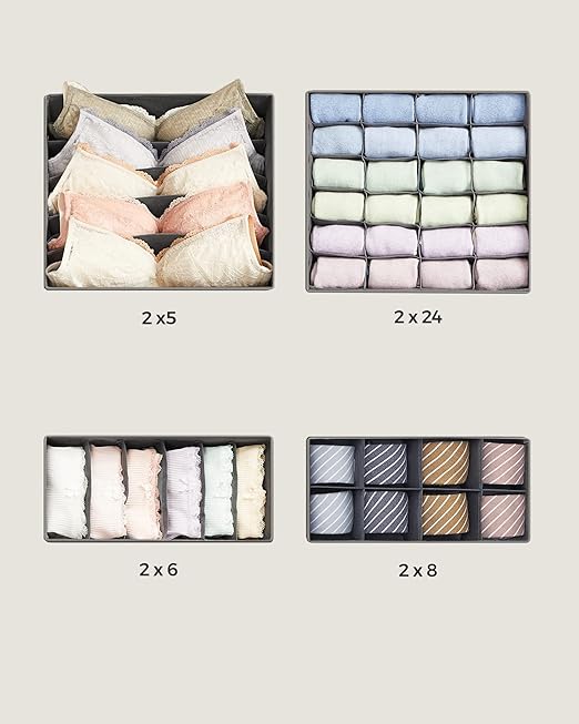 [Farklı boyutlardaki bölmeler] 8 kutu farklı ihtiyaçları karşılar: Sütyenler için 5 bölme (32 x 32 x 10 cm), sütyenler için 6 bölme (32 x 16 x 10 cm) külot, kravatlar için 8 bölme (32 x 16 x 10 cm), çoraplar ve aksesuarlar için 24 bölme (32 x 32 x 10 cm)