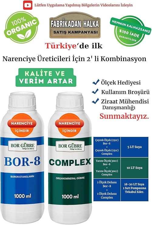 İçin (Complex-1Lt ve Bor-8 1Lt) Organik Sıvı Gübre-Meyve Sayısı, Kalite ve Verim Artar.