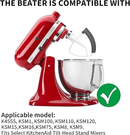 【Uyumlu modeller】Flex Edge tokmak, 4,5qt ve 5qt modellerinin çok sayıda KitchenAid devirmeli blender ile uyumludur. Flex Edge Beater şu modellere uyar: K45SS, KSM100, KSM110, KSM120, KSM15, KSM16, KSM75, KSM8, KSM90.