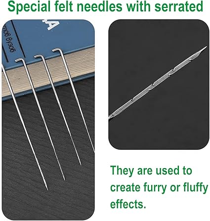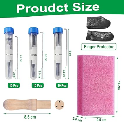 İğne keçe seti: 3 farklı boyutta iğne, 10 adet 7,9 cm, 10 adet 8,6 cm, 10 adet 9 cm, 3 adet iğne şişesi, 1 adet ahşap sap, 2 adet parmak yatağı, 1 adet köpük yastık, farklı yedek ve kullanım ihtiyaçlarınızı karşılayabilir