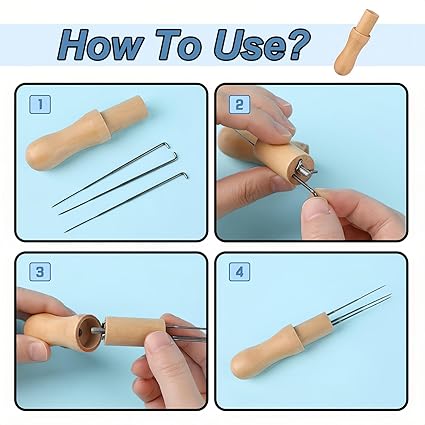 Yüksek kaliteli malzemeler: Keçe iğneler, sert, dayanıklı ve kırılması kolay olmayan metal demirden yapılmıştır ve uzun süre kullanılabilir, ahşap kulpların tümü ahşap malzemeden yapılmıştır, pürüzsüz bir yüzeye sahiptir ve çukursuzdur, bu da kullanımı kolaylaştırır, PU parmak yatakları yumuşaktır ve çalışırken parmağınızı koruyabilir
