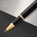 Parlak siyah boya altın süslemelerle süslenmiştir. Ayrıca yazı aleti benzersiz Parker ok klipsine sahiptir.