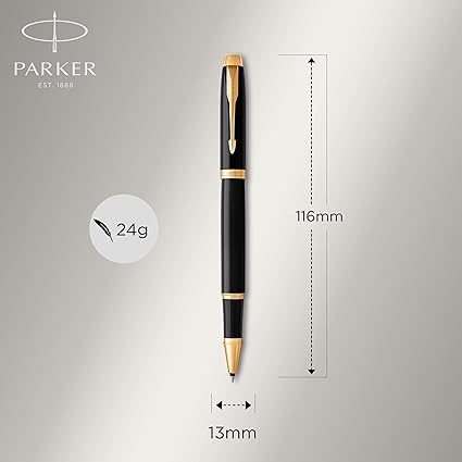 Parlak siyah boya altın süslemelerle süslenmiştir. Ayrıca yazı aleti benzersiz Parker ok klipsine sahiptir.