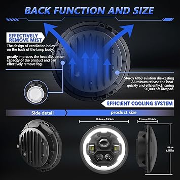 Zarif Tasarım: Döküm alünyumdan yapılmış 7 inç LED far, sağlam ve dayanıklı ve mükemmel ısı dağıtma performansına, tamamen sızdırmaz ve etkili su geçirmezliğe sahiptir, bu nedenle bu 7 ” ledli motosiklet farının 50.000 saatten fazla hizmet ömrü vardır. Lamba gövdesinin arkasındaki havalandırma deliklerinin tasarımı buğuyu etkili bir şekilde giderebilir.