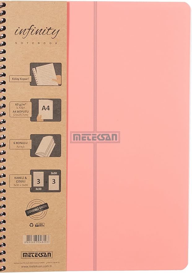 Infinity Pastel Serisi, A4, 6 Konulu (3 Kareli, 3 Çizgili) 180 Yaprak PP Kapaklı Spiralli Defter, Pembe