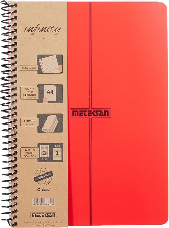 Infinity Primary Serisi, A4, 4 Konulu (3 Kareli, 1 Çizgili) 120 Yaprak PP Kapaklı Spiralli Defter, Kırmızı