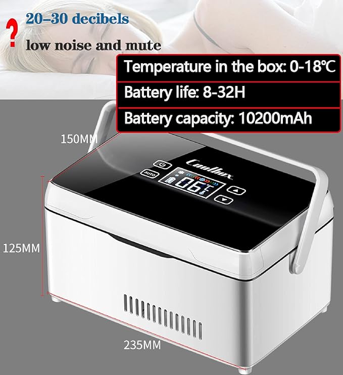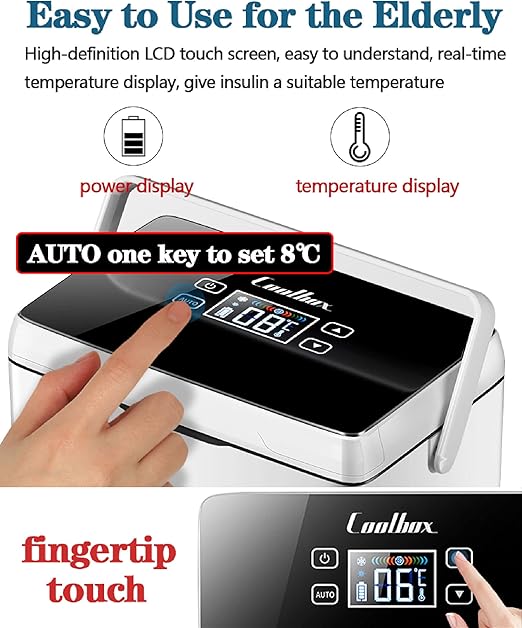 [Özellikler] – İnsülin soğutucu soğutmalı kutu – 1. 0-18 ℃ sıcaklık ayarı, akıllı dokunmatik düğmeler, hassas sıcaklık kontrolü, yaşlılar için mükemmel; 2.15 dakika hızlı soğutma; 3. 20-30 desibel düşük gürültü ve sessiz; 4. Küçük ve taşınabilir tasarım seyahat için uygundur