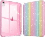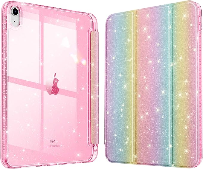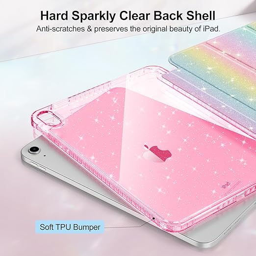 iPad 11./10. nesil (2025/2022 A16 çip) için parıltılı kılıf, kalem tutuculu – şeffaf ince koruyucu kılıf, darbeye dayanıklı ve parıltılı şeffaf arka taraf kızlar/çocuklar için, gökkuşağı