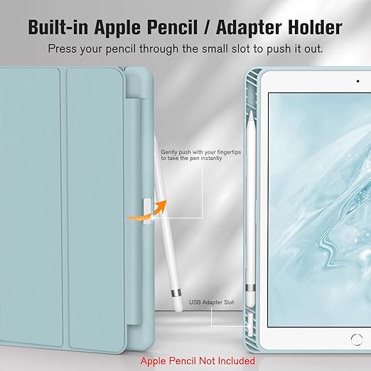 iPad 9. nesil 2021/8 için kılıf. Gen 2020/7. Nesil 2019 10,2 inç – Süper hafif yumuşak TPU Arka Kapak Koruyucu Kılıf Entegre Kalem Tutuculu, Otomatik Uyku / Uyanma, Buz Mavisi
