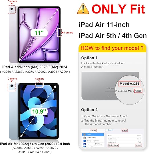 iPad Air 6 için özel olarak tasarlanmıştır. nesil 11 inç 2024, (M2, modeller: A2902 / A2093 / A2904), iPad Air 5. nesil 2022 (modeller: A2588 / A2589 / A2591) / iPad Air 4. nesil 2020 10,9 inç (modeller: A2072 / A2316 / A2324 / A2325) — diğer tüm iPad modelleri ile uyumlu değildir.