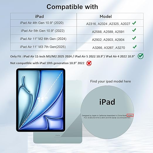 Uyumlu Cihazlar: 4UBonLife Koruyucu Kılıf Apple iPad Air 11 inç (M3) 2025 için uygundur (Model Numarası: A3266/A3267/A3270); iPad Air 11″ M2 2024 için (Model numarası: A2902 A2903 A2904); iPad Air 5. nesil 27.7 için 202 cm 2 (Model numarası: A2589 A2591 A2588); iPad Air 4. nesil 2020 (A2316 A2324 A2325 A2072) için. Not: Diğer önceki model iPad’ler veya diğer cihazlarla uyumlu değildir