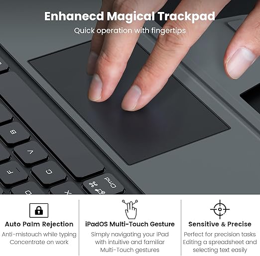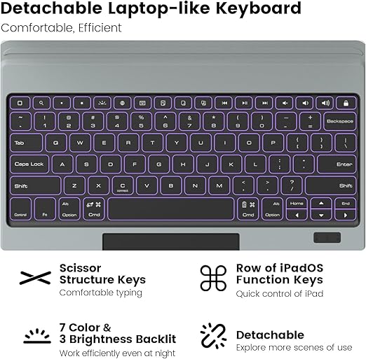 Arkadan Aydınlatmalı Klavye ve Anti-mistouch Teknolojisi İzleme Dörtgeni – Şarj edilebilir arkadan aydınlatmalı klavye, 7 arka ışık rengi ve 3 seviye parlaklık ayarına sahip 12,9 inç iPad pro kılıfı, iPad’i karanlık bir ortamda bile kolayca kullanabilirsiniz. 6. nesil klavyeli iPad pro 12.9 kılıfı, yazı yazmak için sessiz ve rahattır ve kaydırma, kaydırma ve daha fazlası için dahili yüksek hassasiyetli izleme dörtgeni.