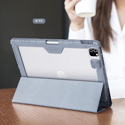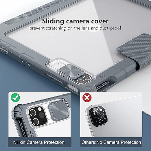 iPad Pro 12,9 inç Kılıf 2022/2021/2020 (6/5/4. Nesil) Sürgülü Kamera Kapağı ve Kalem Tutuculu, PU Deri Koruyucu Stand Kapağı Otomatik Uyanma/Uyuma ile – Gri