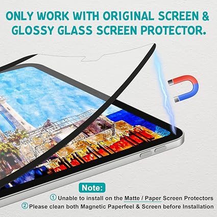 Kolay kurulum: Kolay ve hızlı manyetik kurulum, kabarcık yok. İstediğiniz zaman çıkarın. Uyarı: Kurulum sırasında manyetik tarafın aşağıya baktığından emin olun ve manyetik şeridi ortadan yana doğru itin. Sadece iPad Pro 13 inç M4 2024 modeli ile uyumludur. Uyumlu modeller: A2925, A2926, A3007.