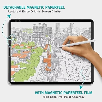 Paperfeel fikirleri ile hayata geçirin: Magnetic Paperfeel iPad Pro 13 2024 kağıdın hassasiyeti, tepki yeteneği ve doğal akışkanlığı sunar. Apple Pencil ile iPad’i not defterinize, tuvalinize veya hayal edebileceğiniz her şeye dönüştürebilirsiniz. UYARI: Kağıt ekran koruyucu folyolar ekranın netliğini etkileyebilir, lütfen satın almadan önce iki kez düşünün.