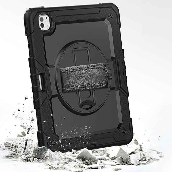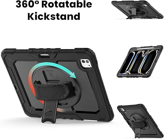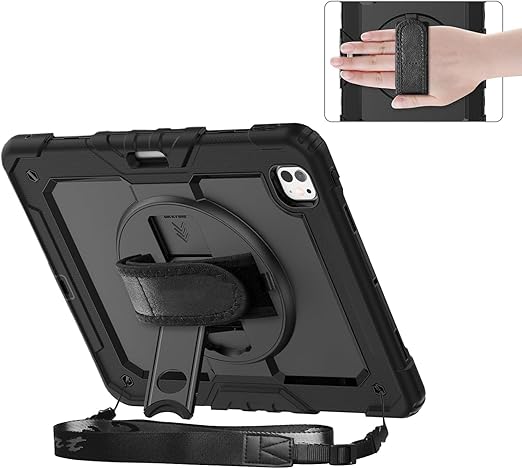 iPad Pro 13 inç M4 2024 7. Nesil için Kılıf (Model: A2925, A2926, A3007) Tam Koruma Darbe Emici, 360° Dönebilen Stand, Ayarlanabilir Omuz Askısı, Kalem Tutucu, Siyah
