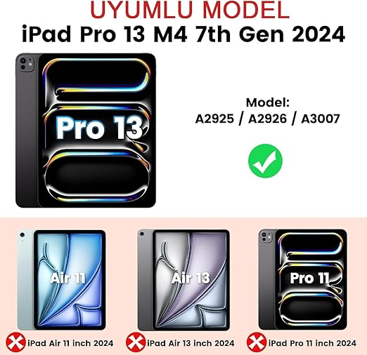 -Uyumluluk: Yeni iPad Pro 13 inç M4 2024 7. Nesil için tasarlanmıştır (Model: A2925, A2926, A3007). Diğer iPad modelleri ile uyumlu değildir. Lütfen satın almadan önce modelinizi onaylayın.