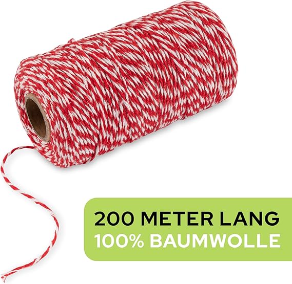 iplik 200 m – Gıda maddelerine uygun mutfak ipliği – Bağlama için bağlama ipi – Kızartma ipi – Kasap ipliği – Pişirme ipliği – Sosis ipliği – Rulet bağlayıcı – Pamuk halat beyaz/kırmızı
