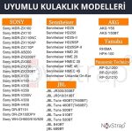 Uyumlu Kulaklık Modelleri : JBL Tune T250; JBL Tune 450BT; JBL Tune T450BT; JBL Tune 460BT; JBL Tune T460BT; JBL Tune 500BT; JBL Tune 510BT; JBL Tune 520BT; JBL Tune 560BT; JBL Tune 600BT; JBL Tune 600; JBL Tune 600BTNC; JBL Tune 660NC; Ayrıca İlan resimlerinde model listesi bulunan Sony ve Philips marka kulalıklar ile Uyumludur.