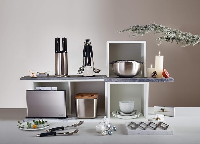Her mutfak aletinin, yere konulduğunda başın çalışma yüzeyine temas etmesini önleyen entegre bir alet dayanağına sahip ağırlıklı bir sapı vardır. Bu elevate çelik atlıkarınca seti, döner bir saklama standına sahip altı temel mutfak aletinden oluşur