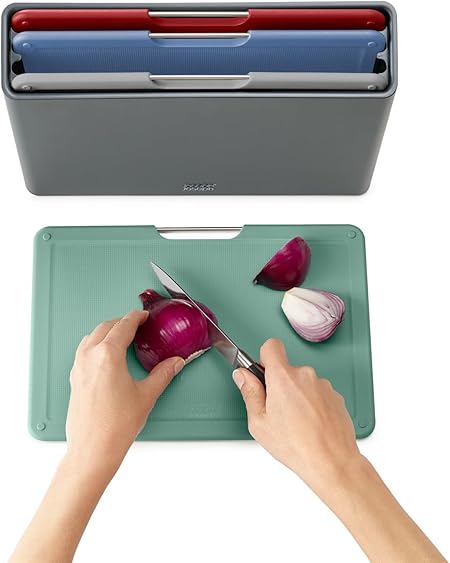 Her iki tarafında da bıçak dostu, dokulu kesme yüzeylerine ve kaymaz ayaklara sahip olan bu tahtalar, akıllı açılı tasarımı ve paslanmaz çelik seçim çubukları sayesinde kolayca kutudan çıkarılabilir