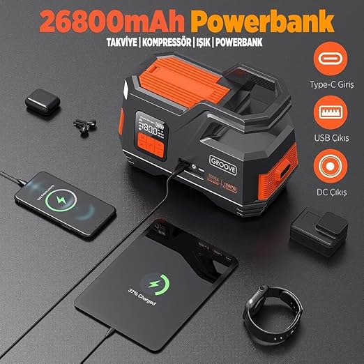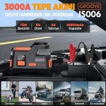 JS006 29200mAh 4500A Akü Takviye Cihazı + Lastik Şişirme Kompresörü Taşınabilir Jump Starter (Kompresör+Powerbank+Led Lamba+LCD Ekran)
