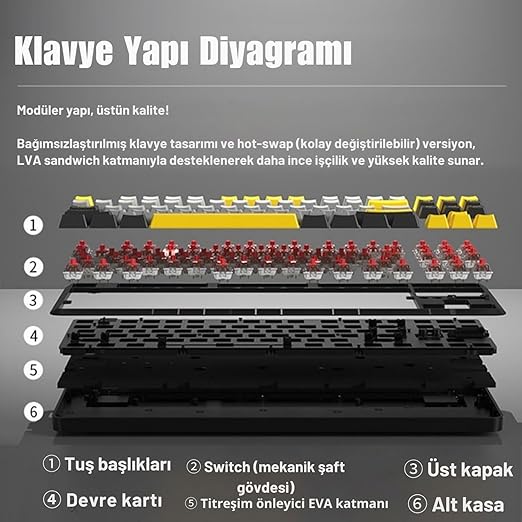 – Rafine Stabilizatörler ve EVA Köpük Desteği Plaka monteli stabilizatörler, piyasadaki yaygın keycap’lerle uyumlu olacak şekilde tasarlanmıştır. Rafine yapı sayesinde gürültü ve metalik ses azaltılır. Tuş takımı altında yer alan EVA köpük, yazarken yumuşak ses ve dengeli bir his sağlar. Bu sayede hem sessiz hem de konforlu bir yazma deneyimi sunar.