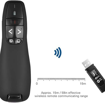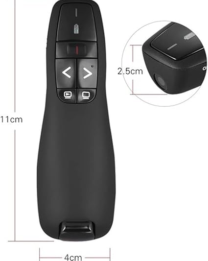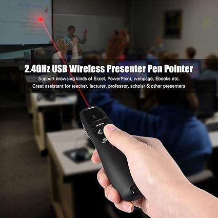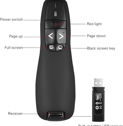 Çoğu arka planı ve yansıtmalı yüzeyi kolayca görmek için parlak kırmızı ışıklı 2,4 GHz kablosuz sunum kalemi. Sayfa yukarı ve aşağı düğmesi, tam ekran, siyah ekran, slayt gösterinizi kontrol etmek için uygun. Dahili gizli USB alıcı tasarımı, tak ve çalıştır.