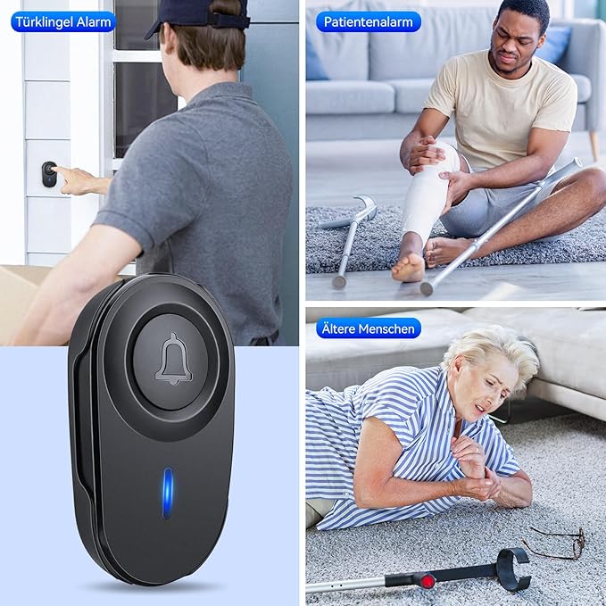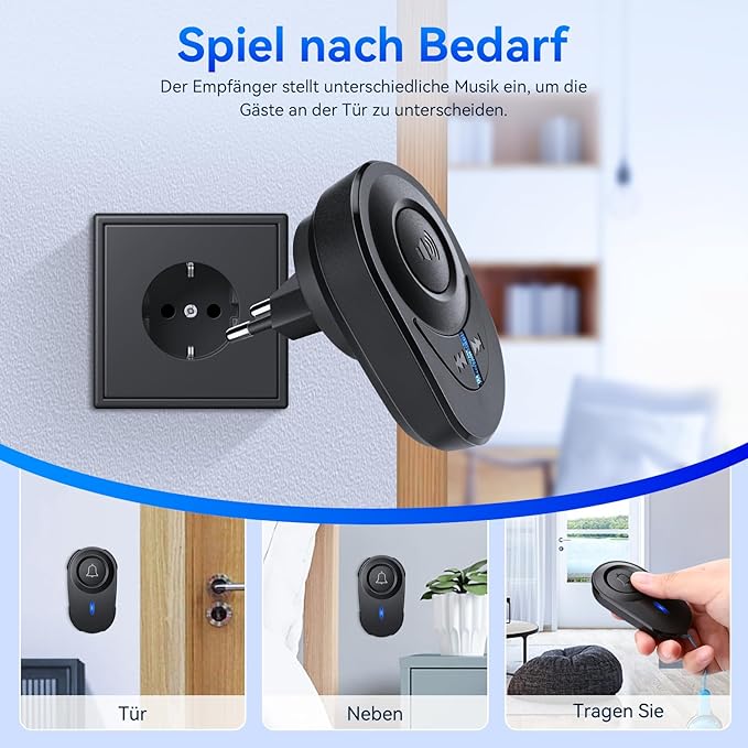 【110 m kablosuz menzil】Kapı zilinin güçlü kablosuz sinyali kapı kaplamalarına ve duvarlara nüfuz edebilir ve sağlam sinyal evinizdeki diğer cihazları rahatsız etmez. 110 metreye kadar alıcı menzili ile ister üst katta ister birden fazla odada olun, kapının önünde bekleyen hiçbir ziyaretçi kaçırmaz. Kapı zilinin menzili yakl. Açık havada 400 metre ve binalarda 110 metre; çok fazla engel olduğunda menzil değişir.