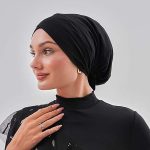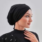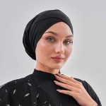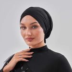Kadın Siyah Tesettür Çapraz Yüzücü Bone – Deniz Havuz Spor Bone – Günlük Kullanım İçin Arkası Lastikli ve Bağlamalı Boynu Açık Tesettür