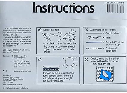 Kullanımı kolay: Güneş ışığını yakalayan nesneler beyaz görünür, kağıdın geri kalanı canlı Prusya mavisi rengindedir. Özel kağıda bir eğrelti otu, çiçek veya başka bir nesne koyun ve kısa süre güneşe koyun. Ardından kağıdı suyla yıkayın ve güzel, uzun ömürlü bir resmin nasıl göründüğünü izleyin