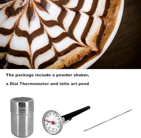 Paket bir Latte Art Cup, bir toz tankı, bir Latte Art iğnesi ve bir süt termometresi içerir.