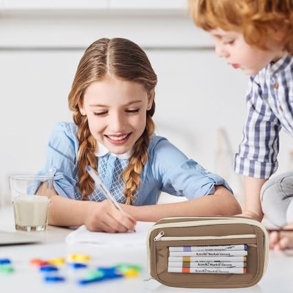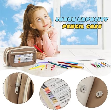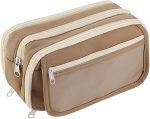 Kalem kutusu, 22 x 8 x 12 cm, aşınmaya dayanıklı, büyük kapasiteli, erkek ve kız çocukları için, daha fazla bölmeli, taşınabilir, estetik kalem kutusu, okul, ofis, ev için (bej), Kahverengi