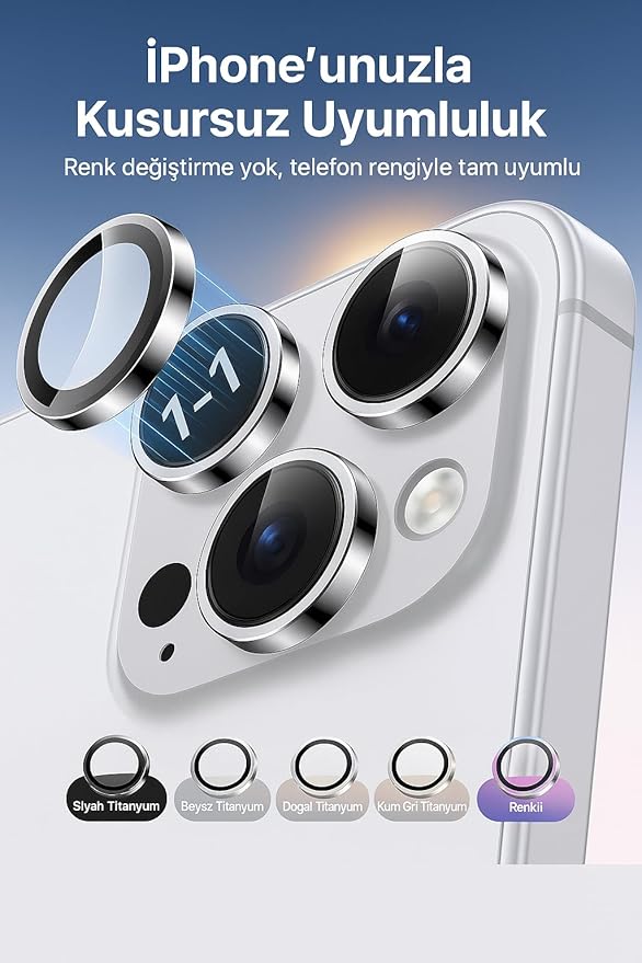 Kamera Lens Koruyucu, Safir Cam, Alüminyum Alaşım Çerçeve, Kolay Kurulum, HD Kalite, Güçlü Yapışma, Çubuk Sökme Aparatlı (Titanyum Gri, IP 17 Pro/Pro Max /16 Pro/Pro Max/15 Pro/Pro Max)