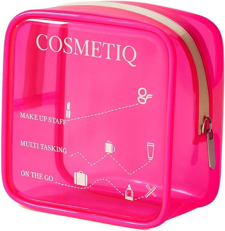 Renk ve Şeffaf Tasarım: Canlı pembe rengi ve şeffaf yapısıyla makyaj çantanızın içinde ne olduğunu hemen görebilirsiniz, böylece ruj, eyeliner veya diğer makyaj malzemelerinizi kolayca bulabilirsiniz. Şeffaf çanta tasarımı aynı zamanda modern ve şık bir görünüm sunar.
