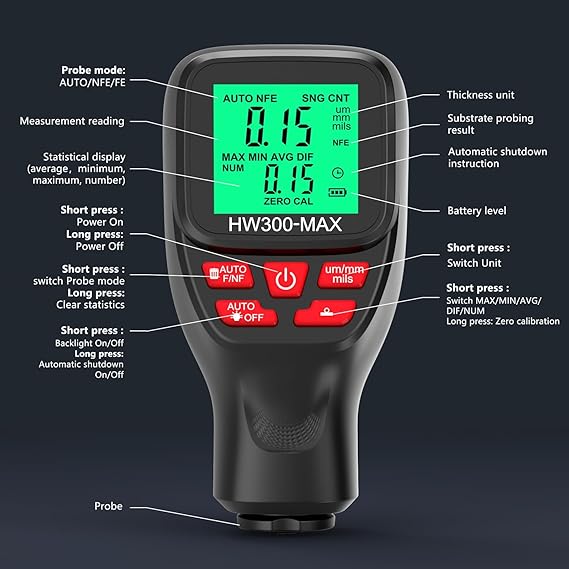 Kaplama Kalınlık Ölçer Araba Boya Kalınlık Ölçer Metal Kaplama ve Kaplama Kalınlığını Üretim, Metal İşleme, Endüstri için Birim Dönüşümüyle (Mikron, Milimetre, Mil) Ölçme