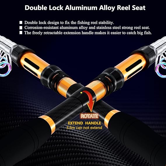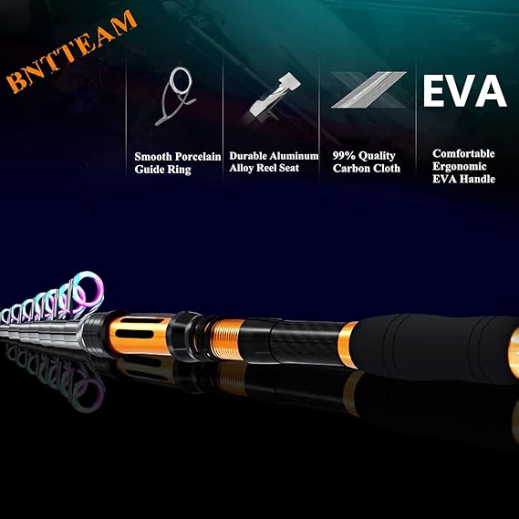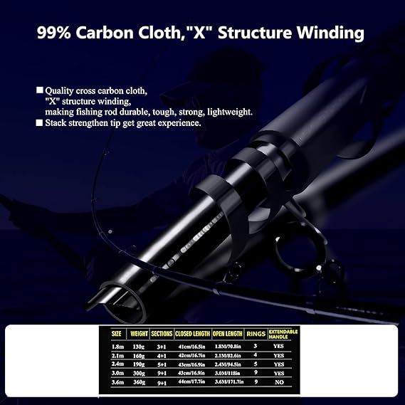 【Hafif ve Taşınabilir】Çubuk 30 tonluk birinci sınıf çok katmanlı karbon boşluktan üretilmiştir, sert ve dayanıklı, kompakt ve hafif, daha güçlü ve hafiftir Taşınabilir ve kapalı uzunlukta taşınabilir, en sevdiğiniz balıkçılık yerine seyahat etmenizi ve istediğiniz zaman ve her yerde balık tutmanın keyfini çıkarmanızı sağlar 【Mükemmel esneklik】Fiberglas ile karıştırılan yüksek yoğunluklu karbon fiber olta oltunuzu sağlam ve dayanıklı hale getirir