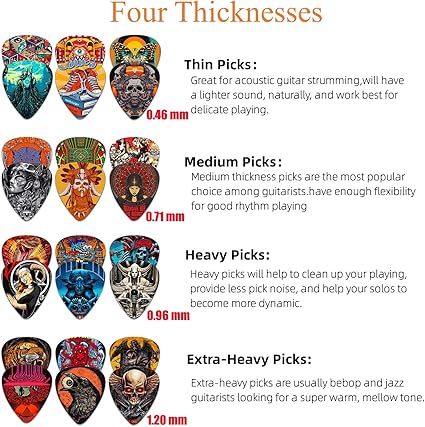 【Kalınlık Çeşitliliği】Akustik gitar için gitar pençeleri bir set 4 farklı kalınlığa sahiptir: ince (0,46 mm); orta (0,71 mm); ağır (0,96 mm); ekstra ağır (1,2 mm). Farklı kalınlıklar, hangi ölçünün size en uygun olduğunu seçmenize izin verebilir. Seçtikleri Elektrik, Klasik, Bas ve Akustik Gitarların yanı sıra Ukulele için de kullanılabilir. Gitara yeni başlayanlar, oyuncular veya profesyoneller için mükemmel bir seçim.