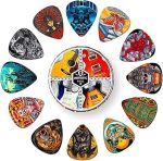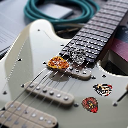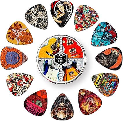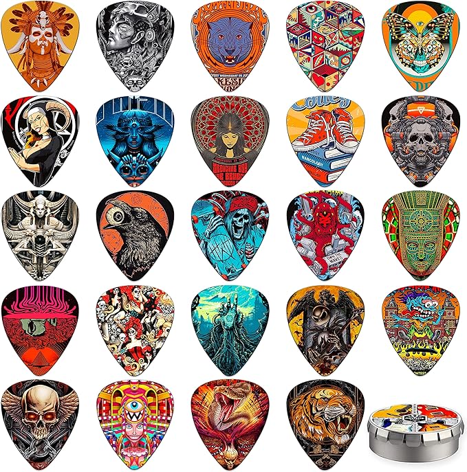 KAREZOG Gitar Seçimleri, 24’lü Paket Selüloit İnce, Orta, Ağır ve Ekstra Ağır Seçimler, Kalay Kutulu Benzersiz Sanatsal Çeşitlilik Paketi Gitar Seçimi, Akustik Gitar, Bas Gitar, Elektro Gitar için (İki