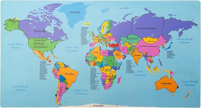 DAYANIKLI MALZEME: Tamamen ahşaptan üretilmiş olup, alt zeminde kıtaların yerleşimi bulunmaktadır