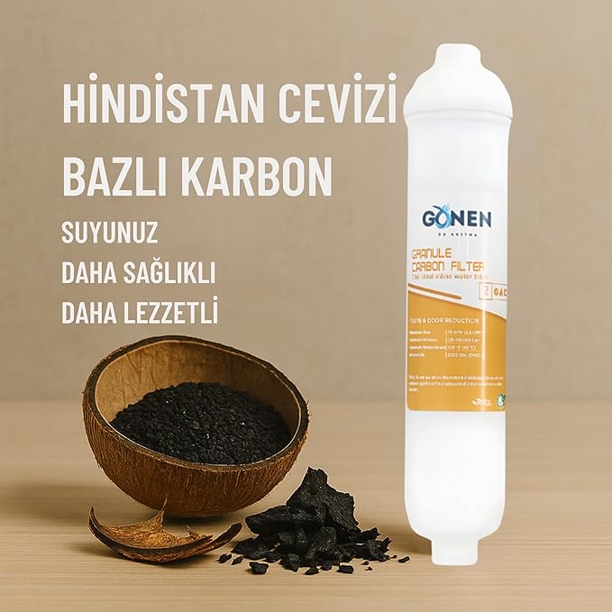 GAC Karbon Filtre: Organik kimyasallar, hidrojen, sülfür, klor gibi suya uygunsuz koku ve tat veren maddeler ayrıştırır. %100 Hindistan Cevizi bazlıdır. Değişim süresi; 8-10 ay aralığındadır.