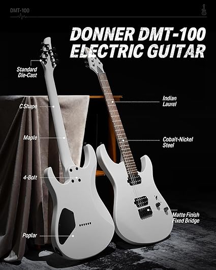 Katı Gövde Elektro Gitar, DMT-100 39 İnç Metal Elektro Gitar, H-H Manyetikli İnşaat Kiti, Çanta, Teller, Askı, Kablo, Rock Müzik Severler için Tel Amortisör (Beyaz)