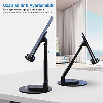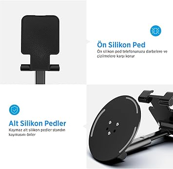 Dayanıklı Yapı ve Güvenli Kullanım Masaüstü telefon tutucu, ABS plastik ve silikon malzemeden üretilmiş olup, soğuk haddelenmiş demir plaka tabanı sayesinde maksimum stabilite sağlar. Kaymaz taban özelliği ile güvenli kullanım sunar.
