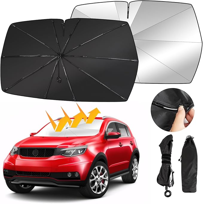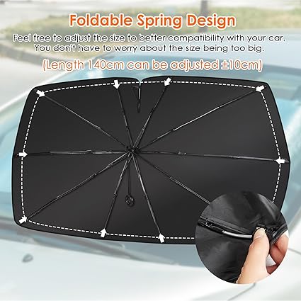 Çoğu araç için uygundur: Lütfen sipariş vermeden önce aracınızı ölçün. Güneşlikler çoğu arabaya uyar. İki boyut vardır: Orta boy 140 x 74 cm ve büyük boyutu 150 x 82 cm’dir. Farklı modellere esnek şemsiye çerçevelerine uyarlanabilir. Uygun olup olmadığını kontrol etmek için sipariş vermeden önce aracınızın ön camının boyutunu ölçmeniz önerilir.
